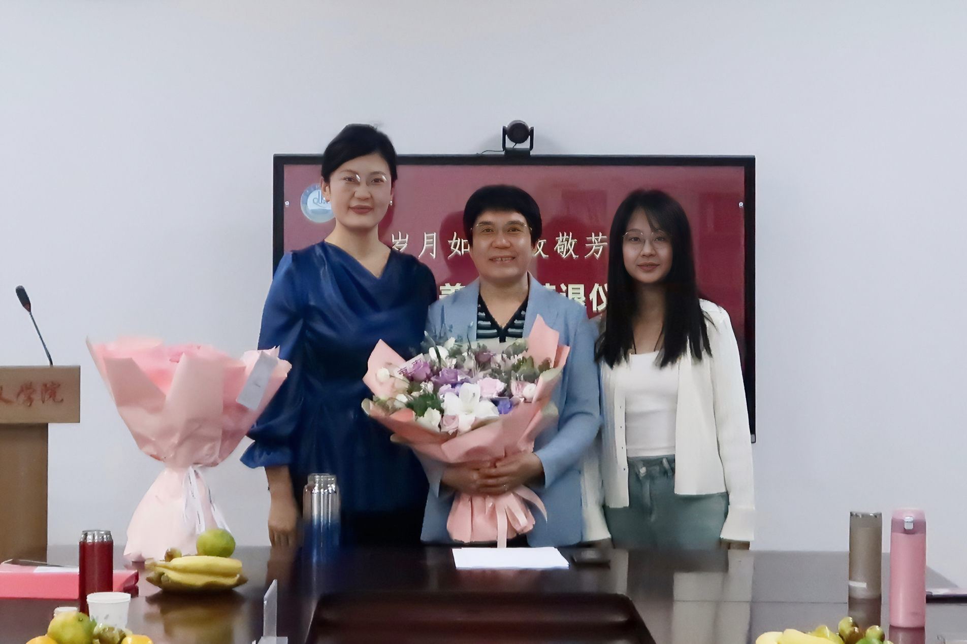 儀式上,工會(huì)主席姜竹青老師向龐桂美教授贈(zèng)送榮休紀(jì)念品,2007級(jí)研究生馬楠和2023級(jí)研究生張琪為龐桂美教授獻(xiàn)上鮮花。