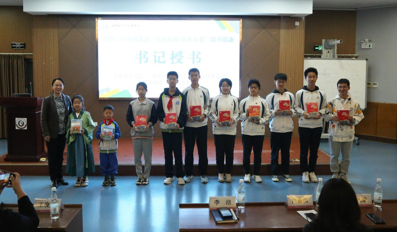 會上,青島二中學(xué)生代表許皓清、青島二中政治發(fā)研室代表高保衛(wèi)、青島二中歷史發(fā)研室主任靳慶然、青島二中黨委書記李潔分別以《讀書之樂樂在無窮》《和一本書相遇》《閱讀與立德樹人》《書記薦讀》為主題進行分享。會議最后,青島二中黨委書記李潔給學(xué)生代表授書。