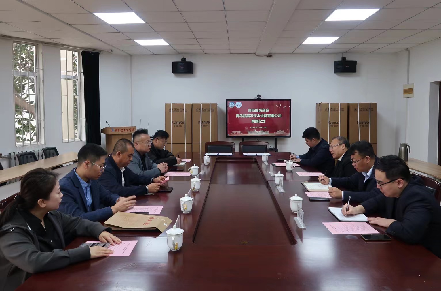11月13日上午,青島臨邑商會(huì)、青島凱美爾飲水設(shè)備有限公司捐贈(zèng)儀式于馬克思主義學(xué)院2010會(huì)議室舉行。青島臨邑商會(huì)會(huì)長(zhǎng)鄭京衛(wèi),青島凱美爾飲水設(shè)備有限公司董事長(zhǎng)、青島臨邑商會(huì)副會(huì)長(zhǎng)肖安平,青島凱美爾飲水設(shè)備有限公司總經(jīng)理李夢(mèng),青島臨邑商會(huì)副秘書(shū)長(zhǎng)滕平瑞、王婧,青島科技大學(xué)合作發(fā)展處處長(zhǎng)王帥,青島科技大學(xué)馬克思主義學(xué)院黨總支書(shū)記李真,青島科技大學(xué)黨委委員、馬克思主義學(xué)院院長(zhǎng)曹勝出席捐贈(zèng)儀式。儀式由青島科技大學(xué)馬克思主義學(xué)院副院長(zhǎng)郭江龍主持。