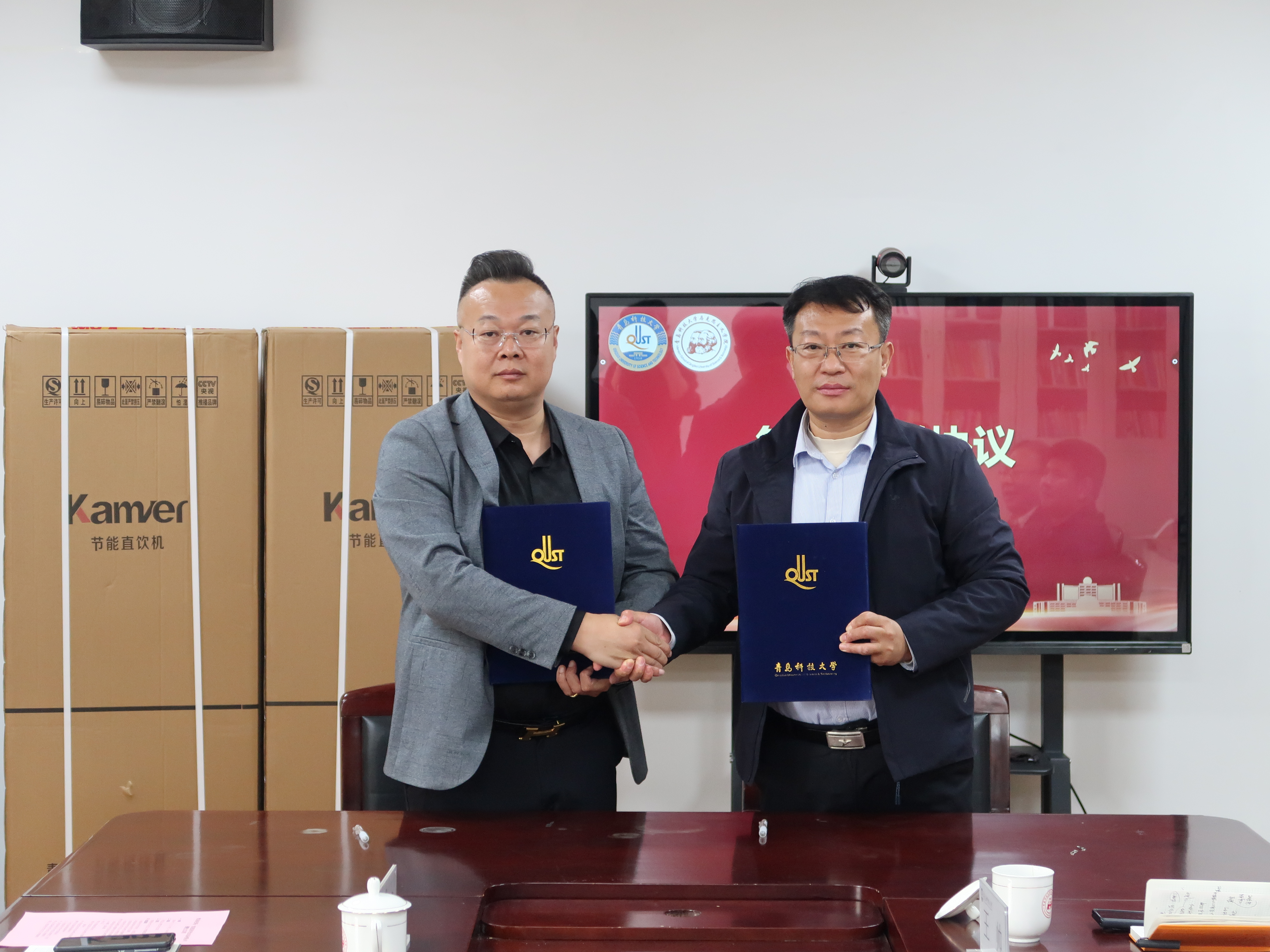 儀式上,青島科技大學(xué)馬克思主義學(xué)院黨總支書(shū)記李真與青島凱美爾飲水設(shè)備有限公司董事長(zhǎng)肖安平簽訂捐贈(zèng)協(xié)議。