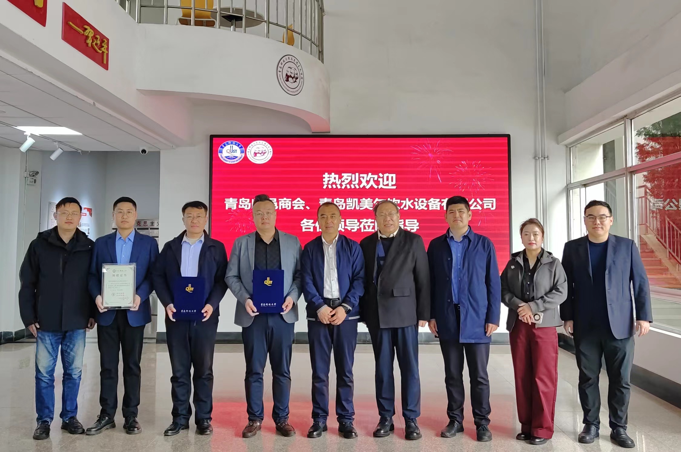 青島科技大學(xué)合作發(fā)展處處長(zhǎng)王帥為青島臨邑商會(huì)會(huì)長(zhǎng)鄭京衛(wèi)、青島凱美爾飲水設(shè)備有限公司董事長(zhǎng)肖安平頒發(fā)捐贈(zèng)證書(shū)。