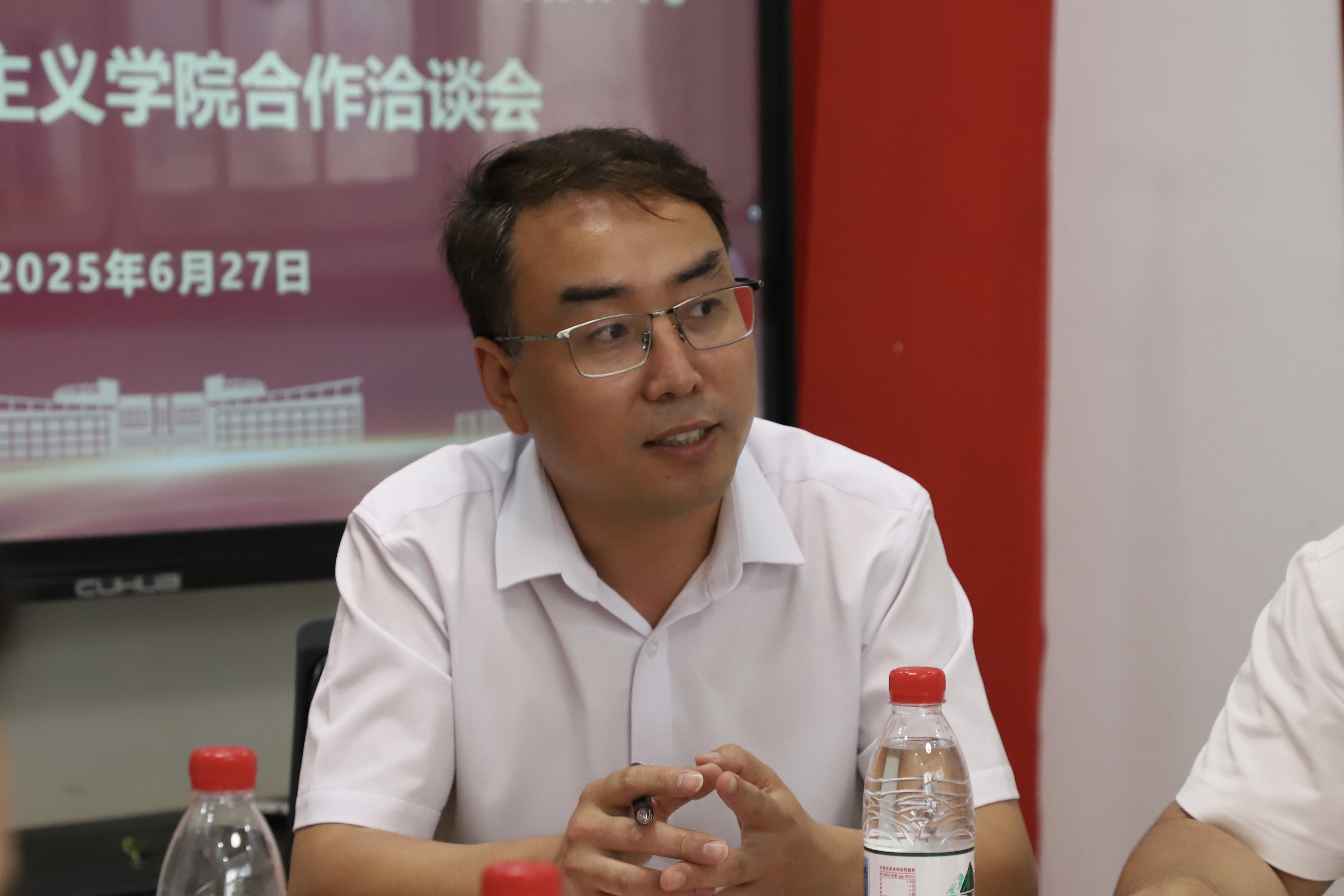 會(huì)上,曹勝對(duì)民建的到來表示熱烈歡迎,并期待雙方在學(xué)科建設(shè)、人才培養(yǎng)、教學(xué)資源共享、學(xué)術(shù)研究等多個(gè)方面開展更為深入的交流,為學(xué)校各項(xiàng)事業(yè)發(fā)展和地方經(jīng)濟(jì)社會(huì)發(fā)展做出貢獻(xiàn)。他指出,要加強(qiáng)黨建引領(lǐng),融合民建經(jīng)濟(jì)界特色與學(xué)院黨建資源,把黨的先進(jìn)理論貫穿合作全程;深化產(chǎn)學(xué)研融合,借助民建企業(yè)資源與學(xué)院科研力量,推動(dòng)思政等領(lǐng)域科研成果轉(zhuǎn)化;優(yōu)化人才培養(yǎng)模式,開展校企聯(lián)合培養(yǎng)。希望與會(huì)雙方以此次合作為契機(jī),持續(xù)深化理論研究和人才培養(yǎng),共同推動(dòng)經(jīng)濟(jì)社會(huì)發(fā)展邁上新臺(tái)階。