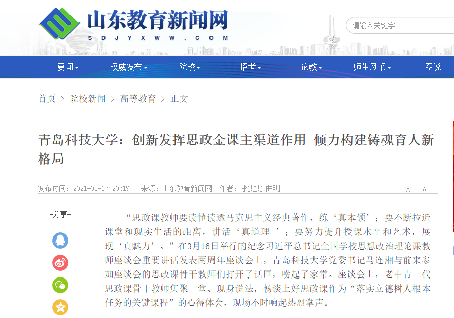 近年來,青島科技大學(xué)始終堅(jiān)決全面貫徹落實(shí)習(xí)近平總書記關(guān)于教育的重要論述特別是關(guān)于高校思想政治理論課的重要指示批示和黨中央決策部署,深入貫徹落實(shí)學(xué)校思想政治理論課教師座談會(huì)、全國教育大會(huì)、全國高校思想政治工作會(huì)議精神,全面推動(dòng)習(xí)近平新時(shí)代中國特色社會(huì)主義思想進(jìn)教材進(jìn)課堂進(jìn)學(xué)生頭腦,努力構(gòu)建機(jī)制健全完善、主體廣泛多元、力量有效聯(lián)結(jié)的新發(fā)展階段思政工作新格局,傾力打造一批真正入腦入心入耳的思政金課,努力做到用習(xí)近平新時(shí)代中國特色社會(huì)主義思想鑄魂育人。