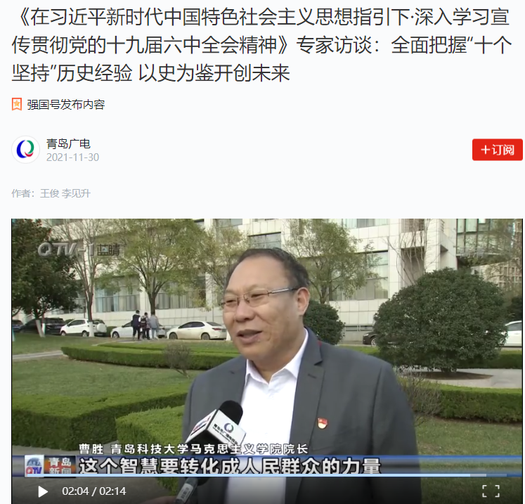 2021年11月30日,青島科技大學(xué)馬克思主義學(xué)院院長曹勝接受青島市廣播電視臺《在習(xí)近平新時代中國特色社會主義思想指引下·深入學(xué)習(xí)宣傳貫徹黨的十九屆六中全會精神》專家訪談采訪。