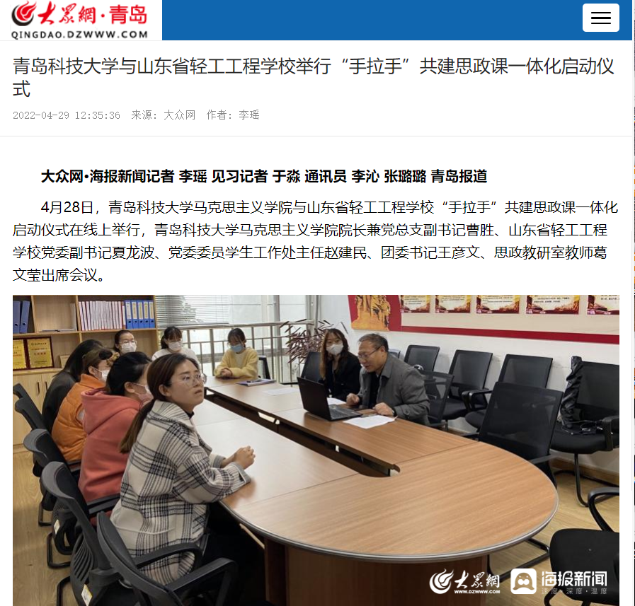 4月28日,青島科技大學(xué)馬克思主義學(xué)院與山東省輕工工程學(xué)校“手拉手”共建思政課一體化啟動儀式在線上舉行,青島科技大學(xué)馬克思主義學(xué)院院長兼黨總支副書記曹勝,山東省輕工工程學(xué)校黨委副書記夏龍波、黨委委員學(xué)生工作處主任趙建民、團(tuán)委書記王彥文、思政教研室教師葛文瑩出席會議。
