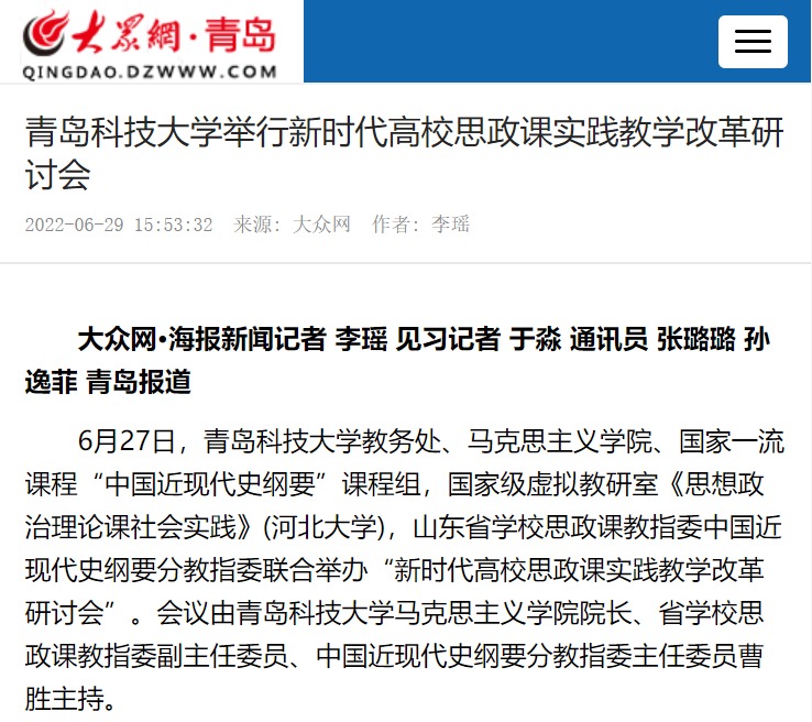 6月27日,青島科技大學教務處、馬克思主義學院、國家一流課程“中國近現(xiàn)代史綱要”課程組,國家級虛擬教研室《思想政治理論課社會實踐》(河北大學),山東省學校思政課教指委中國近現(xiàn)代史綱要分教指委聯(lián)合舉辦“新時代高校思政課實踐教學改革研討會”。會議由青島科技大學馬克思主義學院院長、省學校思政課教指委副主任委員、中國近現(xiàn)代史綱要分教指委主任委員曹勝主持。