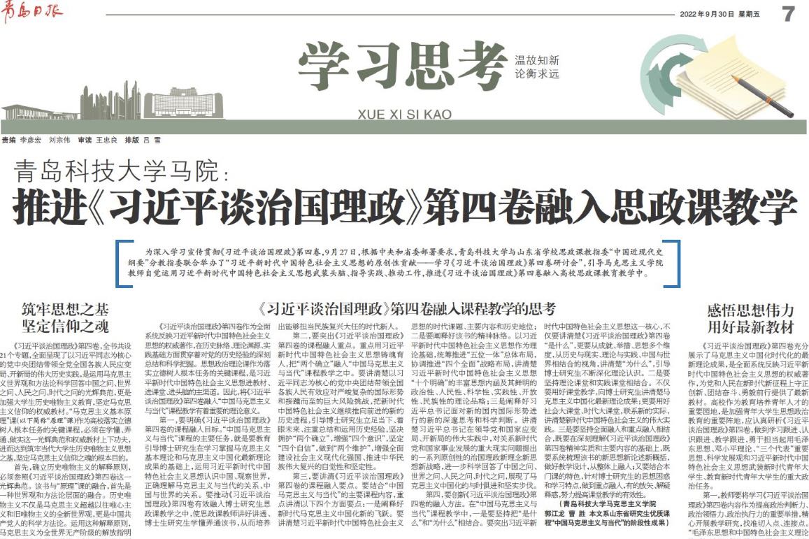 為深入學習宣傳貫徹《習近平談治國理政》第四卷,9月27日,根據(jù)中央和省委部署要求,青島科技大學與山東省學校思政課教指委“中國近現(xiàn)代史綱要”分教指委聯(lián)合舉辦了“習近平新時代中國特色社會主義思想的原創(chuàng)性貢獻——學習《習近平談治國理政》第四卷研討會”,引導馬克思主義學院教師自覺運用習近平新時代中國特色社會主義思想武裝頭腦、指導實踐、推動工作,推進《習近平談治國理政》第四卷融入高校思政課教育教學中。