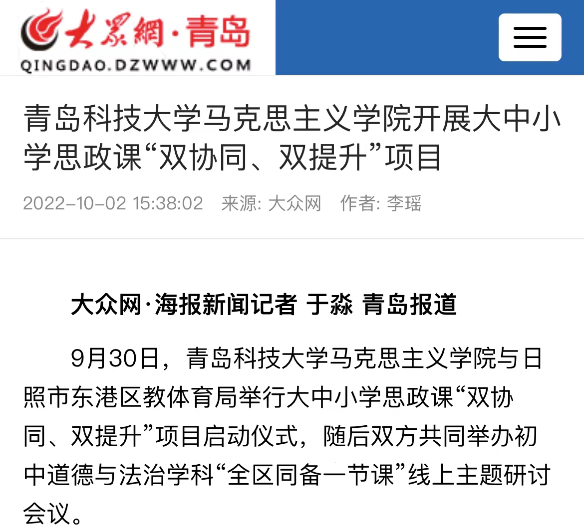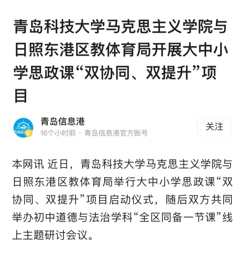 9月30日,青島科技大學(xué)馬克思主義學(xué)院與日照東港區(qū)教體育局大中小學(xué)思政課“雙協(xié)同、雙提升”項目正式啟動。據(jù)悉,雙方將在教學(xué)、科研、隊伍建設(shè)等方面的合作將全面展開。