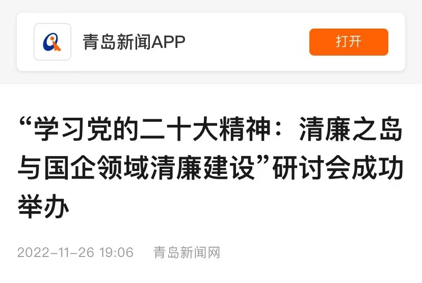 11月26日,“學習黨的二十大精神:清廉之島與國企領域清廉建設”理論研討會在青島召開,中國社科院研究員朱繼東,中國政治學會副會長包心鑒,山東大學黨建研究中心主任王韶興,黨的二十大代表、山東科技大學黨委書記羅公利等專家圍繞學習貫徹黨的二十大精神作報告。