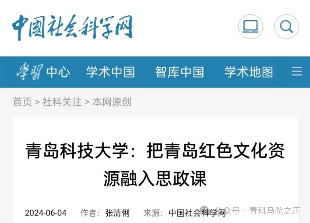 2023年12月16日,青島市社會(huì)科學(xué)界聯(lián)合會(huì)、青島市社會(huì)科學(xué)院、青島科技大學(xué)馬克思主義學(xué)院聯(lián)合成立青島市歷史文化研究中心,旨在加強(qiáng)對(duì)青島市紅色文化資源進(jìn)行研究。