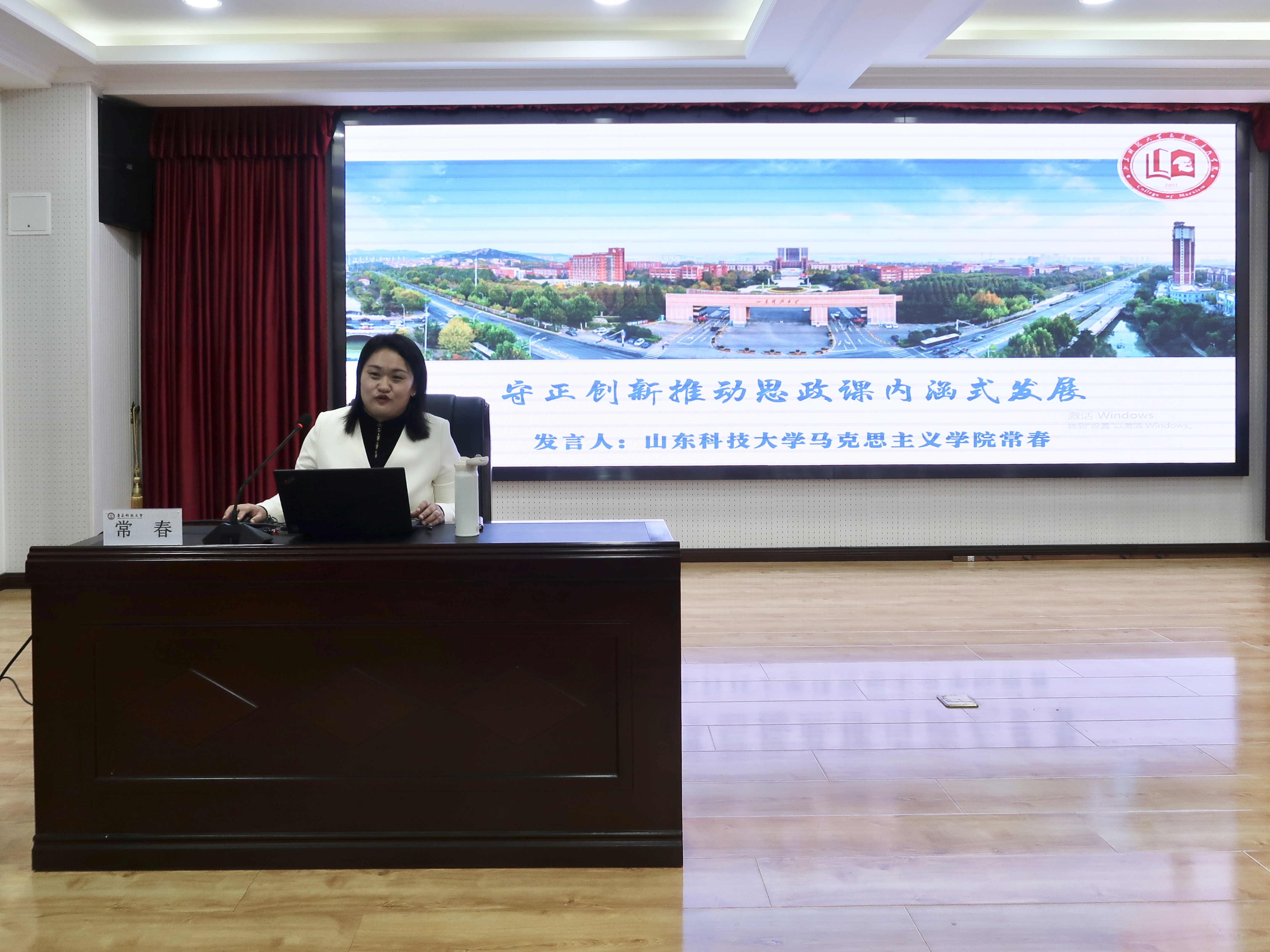 論壇主旨報(bào)告階段,由馬克思主義學(xué)院副院長(zhǎng)郭江龍主持。山東科技大學(xué)馬克思主義學(xué)院副院長(zhǎng)、山東省普通高等學(xué)校教學(xué)名師、山東省教學(xué)成果一等獎(jiǎng)獲得者、山東省學(xué)校思政課“思想道德與法治”分教指委委員常春教授以《守正創(chuàng)新推動(dòng)思政課內(nèi)涵式發(fā)展》為題作專題報(bào)告,思政課教師要以中國(guó)特色社會(huì)主義取得的舉世矚目成就為內(nèi)容支撐,以中華優(yōu)秀傳統(tǒng)文化、革命文化和社會(huì)主義先進(jìn)文化為力量根基,用鮮活的素材、靈活的方式增強(qiáng)思政課的思想性、理論性和親和力、針對(duì)性,堅(jiān)持在守正創(chuàng)新中推動(dòng)思政課建設(shè)高質(zhì)量發(fā)展。