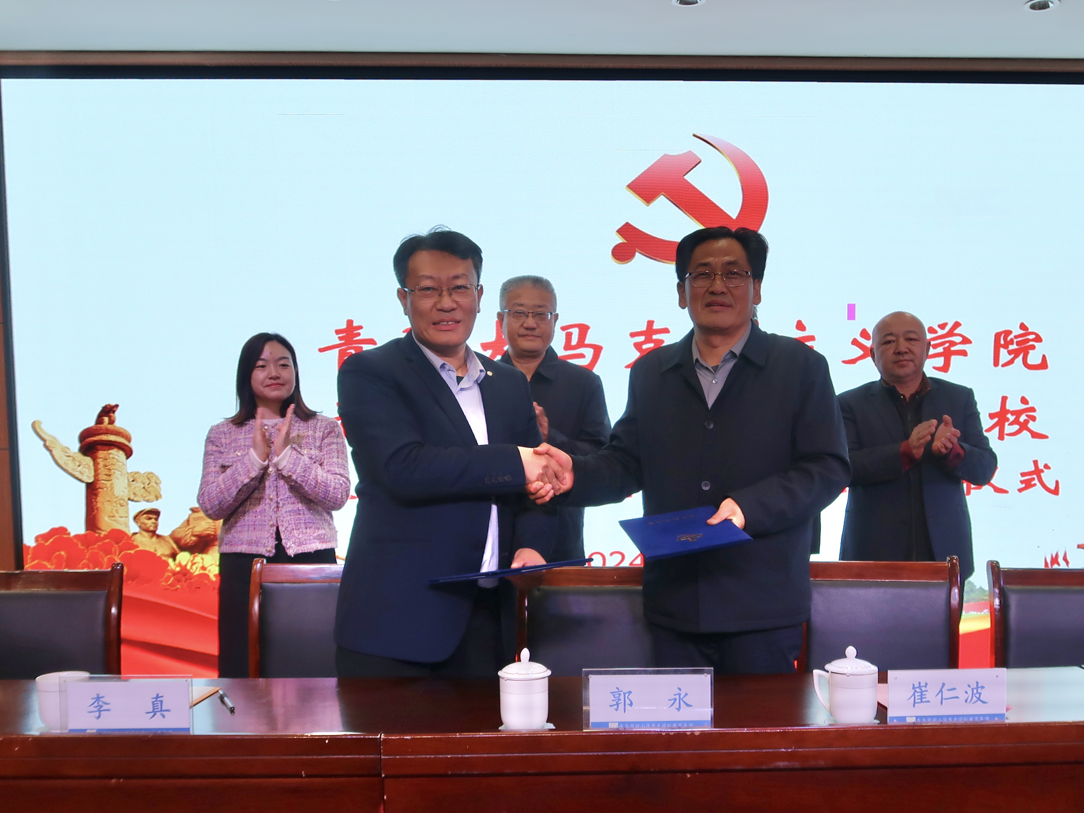 青島科技大學(xué)馬克思主義學(xué)院黨總支書記李真與嶗山區(qū)育才學(xué)校教育集團校長崔仁波進行合作協(xié)議簽訂。