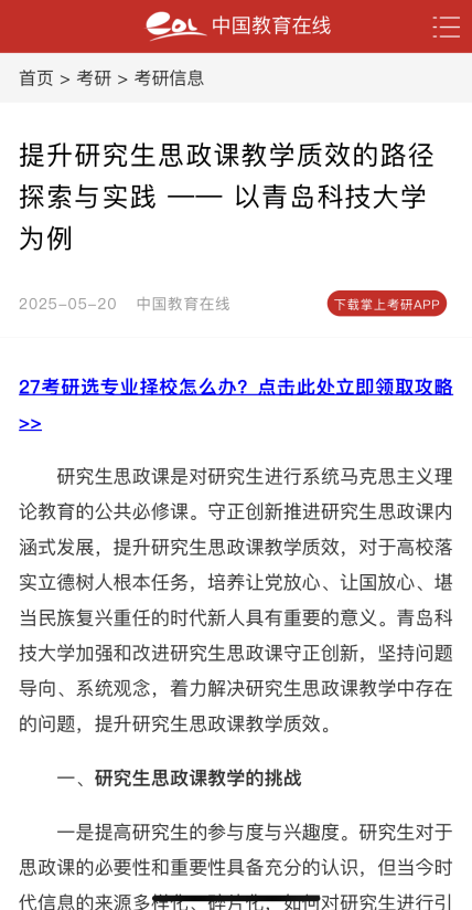 《中國教育在線》:提升研究生思政課教學(xué)質(zhì)效的路徑探索與實踐 —— 以青島科技大學(xué)為例