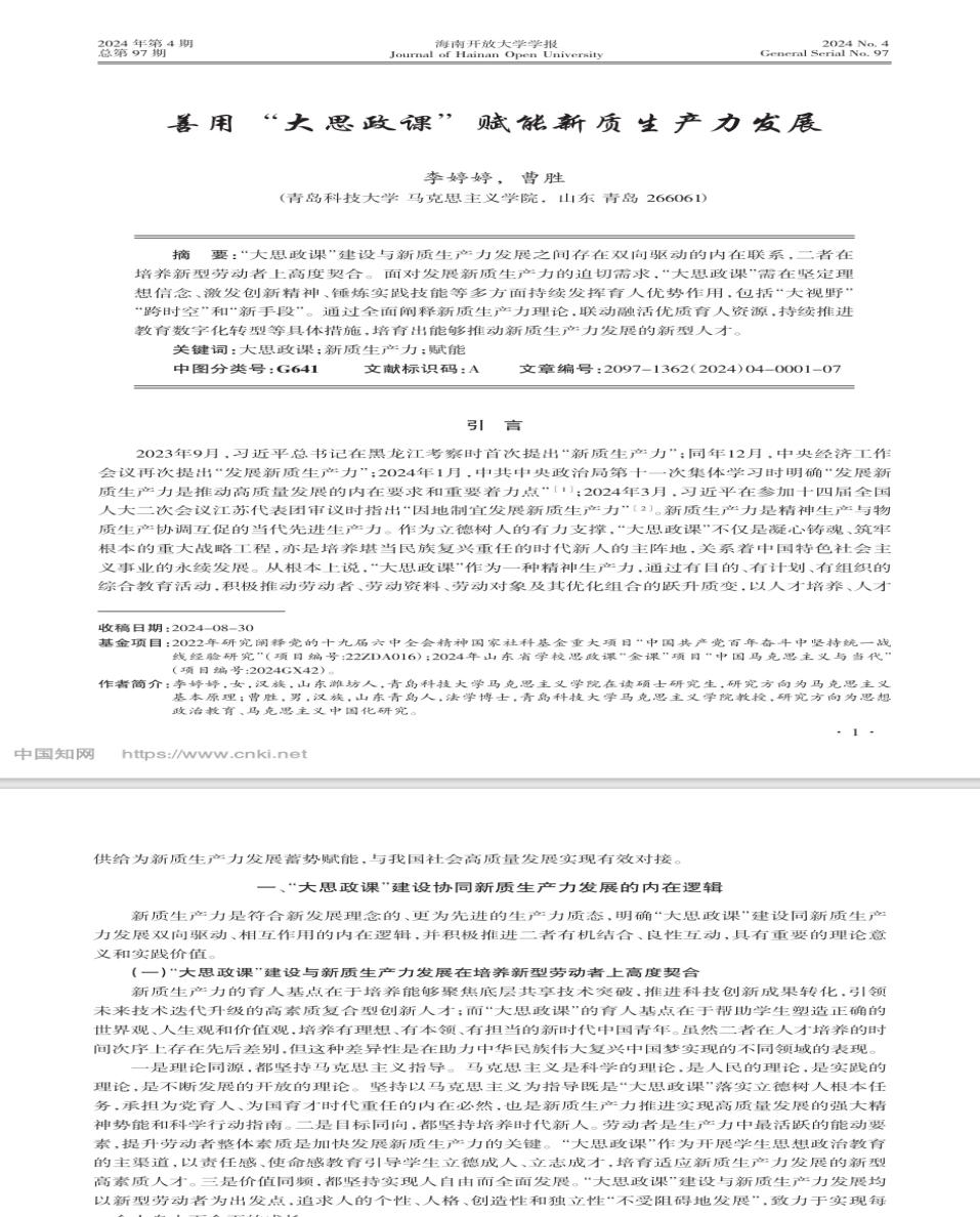 《海南開放大學學報》:善用“大思政課”賦能新質(zhì)生產(chǎn)力