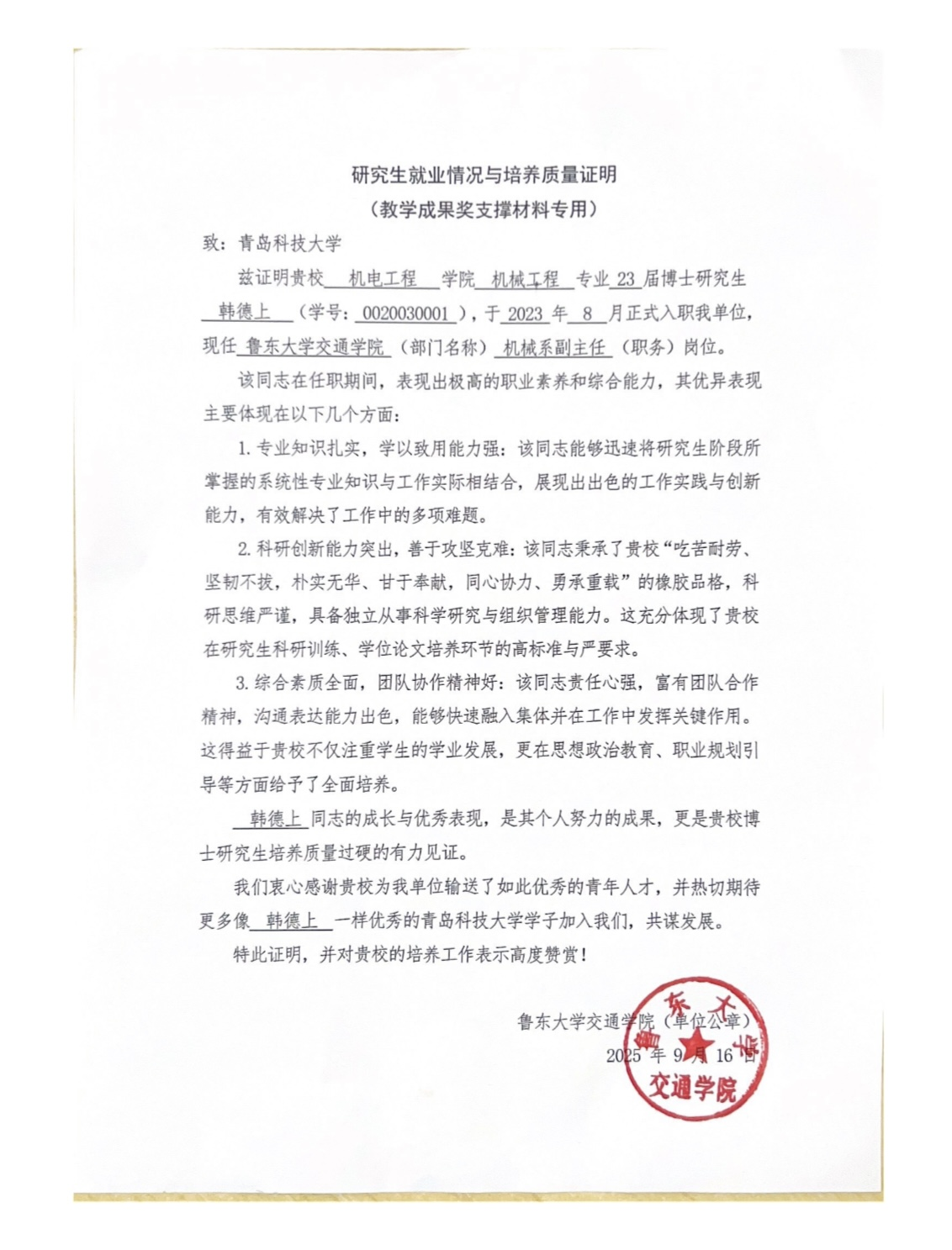2023屆機(jī)電工程學(xué)院博士研究生韓德上入職魯東大學(xué)交通學(xué)院機(jī)械系副主任崗位