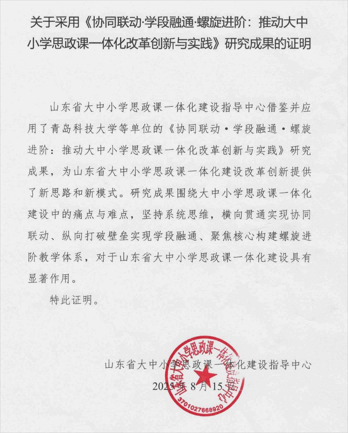 山東省大中小學(xué)思政課一體化建設(shè)指導(dǎo)中心應(yīng)用證明